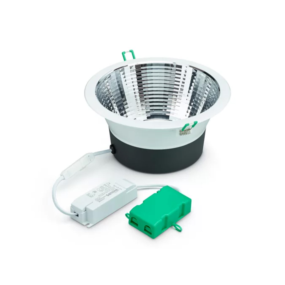 Met een diameter van ø150 mm is het armatuur geschikt voor standaard inbouwmaten. De DN142B-serie maakt deel uit van de Philips CoreLine-familie en staat bekend om zijn hoge energie-efficiëntie, lange levensduur tot 50.000 uur, en onderhoudsarme werking. Het armatuur is voorzien van een geïntegreerde driver en biedt een snelle, gereedschapsloze installatie.